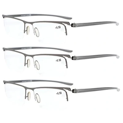 ▲ FRAME HEIGHT - Men's reading glasses without spring hinges. Frame height about 1.26 inches (32mm). ▲ HALF-RIM DESIGN - Lightweight half-rim cheater glasses are suitable for different face types. ▲ METAL FRAME AND CLEAR LENSES - The frame is made of quality metal. The lens are crystal clear. ▲ 3 PACK READERS FOR MEN - You can keep a pair in the bedroom, a pair in the living room, and a pair in the office. You don't need to run around looking for glasses when you want to read. ▲ NO RISK TO TRY - In case any broken problem happens, please do not hesitate to contact Eyekepper customer service to solve the problem until you are satisfied.