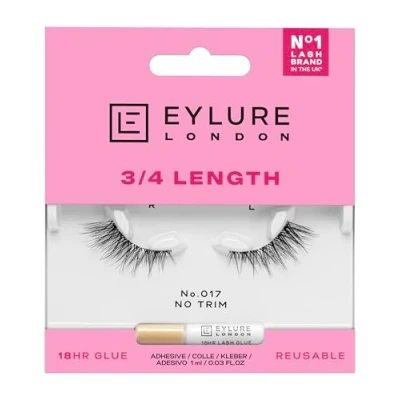 Enhance your look with the Eylure London 3/4 Length No.017 lashes. With a soft, fluffy texture and added length toward the outer corner, this style is perfect for achieving a lifted look. This ¾ lash is a no-fuss, no-measure, no-trim option that creates an elongated and lifted finish. Reusable and every lash pack includes our latex-free lash glue, offering a secure hold that lasts up to 18 hours. Suitable for contact lens wearers. Cruelty-free & vegan-friendly.