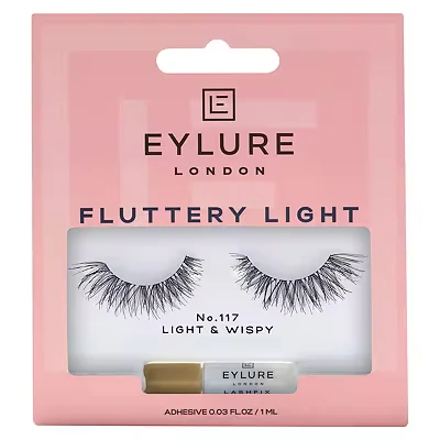 Eylure's Fluttery Light No. 117 false eyelashes are a long Angled lash with a twisty Messed up finish to add thickness Latex-free lash glue included No glue, mess and stress