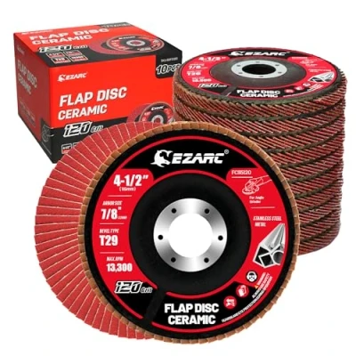 【Ceramic Abrasive】These flap discs are made with industrial-grade ceramic abrasives, offering double the grinding power and superior heat dissipation. Ceramic discs also last 3X longer than zirconia discs and 5X longer than aluminum oxide discs 【Master of Polishing & Grinding】Ceramic flap discs are excellent for fast aggressive stock removal and weld finishing. They cut faster and last longer than conventional grits, which make them ideal for weld grinding, beveling, edge deburring, blending, finishing, surface preparation, and weld spatter removal 【Type 29 Backing】Designed with Type 29 backing helps with contouring edges. It’s perfect for a range of tasks, including rust removal, polishing, finishing, and weld bead cleanup. The fiberglass backing of the flapper disc features a robust resin-fiber structure that absorbs vibrations and enhances impact resistance 【Specifications】The 120 grit angle grinder sanding disc is perfect for aggressive material removal. With a 115mm diameter and a 22.23mm arbor, this flap wheel fits angle grinders running at speeds up to 13,300 RPM 【Engineered to Last】The flap disc 115mm for angle grinder is suitable for non-ferrous metals, cast iron, aluminum, and steel, with exceptional performance on stainless steel. It offers a 50% improvement in cutting performance over zirconia abrasives