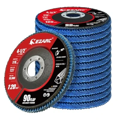 【Upgraded High-Density Flaps】 EZARC flap discs 115mm for angle grinder feature 90 abrasive flaps, offering 25% more than the standard 72-flap discs, resulting in greater durability, improved grinding efficiency, and smoother performance. 【T27 Design for Optimal Stability】 The T27 design ensures excellent stability and efficiency, especially during flat surface polishing, making these 115mm flap discs the ideal choice for both DIY enthusiasts and professionals. 【Premium Zirconia Oxide Grains】 Made with uniformly sized zirconia oxide grains, these angle grinder flap discs deliver a high-quality finish and minimize premature wear caused by inconsistent grit size, extending the disc’s lifespan 【Efficient Vibration Absorption】 The combination of resin fiber and fiberglass backing absorbs vibrations, enhancing stability and grinding efficiency without creating mess or debris 【Professional-Grade Compatibility】 With a 115 mm diameter and 22.5 mm arbor, these 120 grit flap discs are compatible with angle grinders up to 13,300 RPM, designed for grinding, blending, sanding, and finishing a wide range of materials