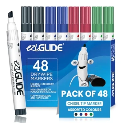 Eziglide Assorted Chisel Tip Drywipe Whiteboard Pens, Bulk Pack of 48 Colour Markers, No Residue Ink, Hard wearing Fibre Medium Dry Wipe Pen, Black, Red, Blue and Green