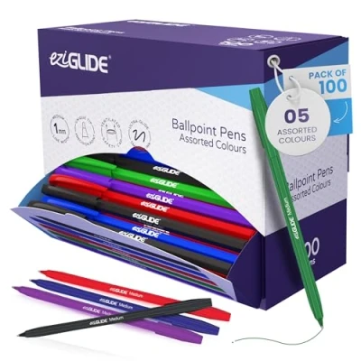 Eziglide Ballpoint Assorted Pen, Pack of 100 Pens, Smooth Writing Action Medium Point 1.0mm Coloured Pens Multipack Ball Ideal for School, Home or Work Stationery Supplies