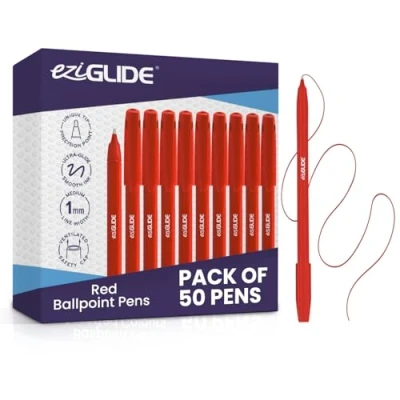 Eziglide Ballpoint Red Pens, Pack of 50 Smooth Writing Action Medium Point Nib (1.0mm) Ball Pens Multipack, Ideal for School, Work, Home stationery