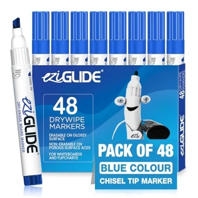 Eziglide Blue Chisel Tip Drywipe Whiteboard Pens, Bulk Pack of 48 Markers, No Residue Ink, Hard wearing Fibre Dry Wipe Pen, Ideal for School, Home and Work