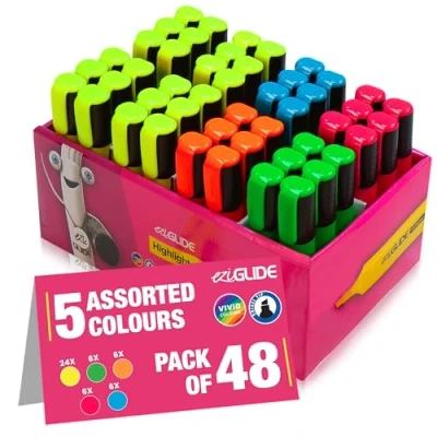 𝐏𝐫𝐞𝐦𝐢𝐮𝐦 𝐇𝐲𝐝𝐫𝐨𝐜𝐚𝐫𝐛𝐨𝐧 𝐓𝐢𝐩: EziGlide Highlighters Pens boast a premium hydrocarbon chisel tip for smooth and clear marking on paper & card ensuring precise but bold highlighting 𝐄𝐫𝐠𝐨𝐧𝐨𝐦𝐢𝐜 𝐬𝐡𝐚𝐩𝐞𝐝 𝐛𝐚𝐫𝐫𝐞𝐥: Making it easy and comfortable to hold when highlighting, underlining and note marking. Cute stationary for home or the office and great marker highlighter pens for school 𝐕𝐢𝐛𝐫𝐚𝐧𝐭 𝐟𝐥𝐮𝐨𝐫𝐞𝐬𝐜𝐞𝐧𝐭 𝐰𝐚𝐭𝐞𝐫 𝐛𝐚𝐬𝐞𝐝 𝐢𝐧𝐤: Perfect highlighter pens multipack for revision stationary & colour-coding, drawing, designing and colouring. Great mini highlighters or bullet journal pens 𝐅𝐥𝐞𝐱𝐢𝐛𝐥𝐞 𝐖𝐫𝐢𝐭𝐢𝐧𝐠 𝐖𝐢𝐝𝐭𝐡: Chisel Tip enables you to draw a Fine or Broad line (1 - 4.5mm width), which is great for not only highlighting but also underlining and colouring 𝐄𝐳𝐢𝐆𝐥𝐢𝐝𝐞’𝐬 𝐏𝐚𝐜𝐤𝐚𝐠𝐞 𝐈𝐧𝐜𝐥𝐮𝐝𝐞𝐬: 48-Pack Highlighter Box incl. 24 × Yellow Highlighter Pens, 6 × Green Highlighters, 6 × Pink Highlighter Pens, 6 × Blue Highlighter Markers, and 6 × Orange Highlighters