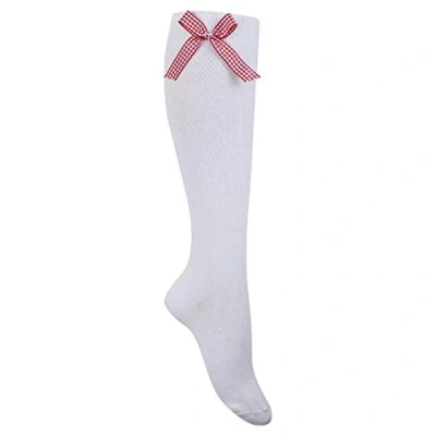 F & S LTD 3 X Pairs of Girls Children's Gingham White Long Knee High Socks With Colored Check Bow Uniform Back School (Shoe Size 9 12 (4 7 Years), Red)