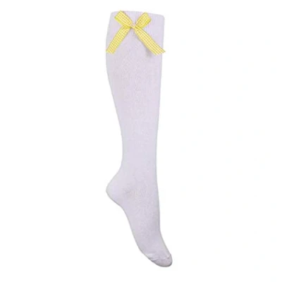 F & S LTD 3 X Pairs of Girls Children's Gingham White Long Knee High Socks With Colored Check Bow Uniform Back School (Shoe Size 9 12 (4 7 Years), Yellow)
