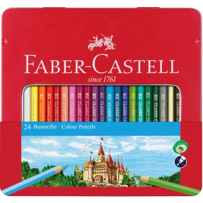 The Faber-Castell Classic Colour Pencils Tin of 24 offers vibrant, break-resistant pencils with a comfortable hexagonal grip, made from sustainably sourced wood and stored in a sturdy tin—perfect for artists and students seeking quality and durability for their creative projects.