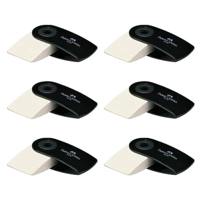 Ergonomically shaped quality eraser for comfortable, soft erasing The eraser in the size 24 x 10 x 54 mm is suitable for lead and coloured pencils It is PVC-free and ideal for clean and smear-free erasing The plastic case protects the eraser from dirt The set contains 6 erasers with black protective case
