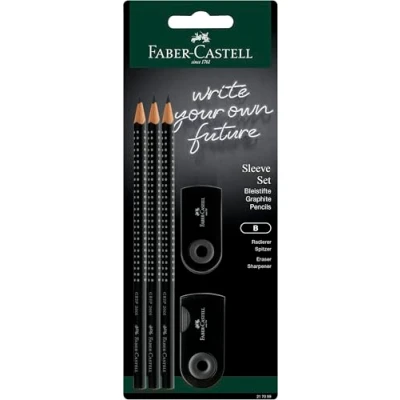 FABER CASTELL 217086 Sleeve Pencil Set with Sharpener, Eraser and 3 Pencils, Grip 2001 Writing Black