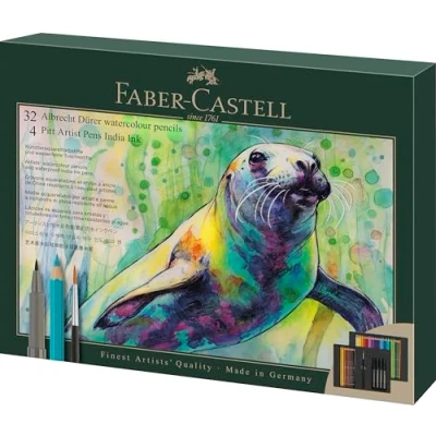 ALBRECHT DURER High-quality pencils, acid-free pigments in bright colours, offering unsurpassed lightfasness. Features fully water soluble lead, and soft, vibrant colour laydown. Essential art supplies for adult PITT ARTIST PEN Features pigmented, waterproof and permanent India ink. Offers high lightfastness. Pens have a reliable, even flow of ink, with the point gliding smoothly over the paper. Ink is archival quality. Suited to drawing, plans, layout work QUALITY Eco pencil. Made in Germany, wood from sustainable forestry. Presented in a lovely box. When looking for top-quality art product there really is nothing better than Faber-Castell supplies GIFT Faber-Castell Albrecht Dürer & Pitt Pen Gift Set, 37 Piece Set makes a perfect present for any artist, whether professional or hobby artist alike. Watercolour meets waterproof, with Albrecht Dürer & Pitt Artist Pen BRAND Faber-Castell is globally renowned and loved. They are a world leading manufacturer of top-quality, innovative art materials. Faber-Castell have become the go-to brand for artists for centuries, whether professional or hobby artist