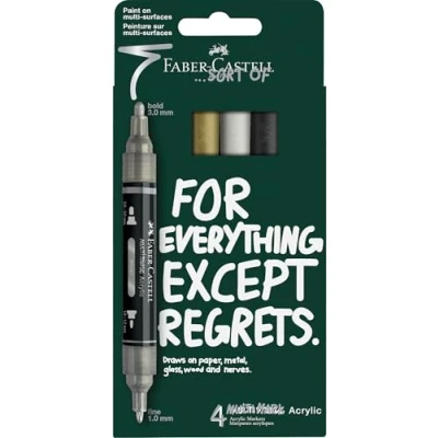 USE Meet the rebellious child of a noble family! Faber-Castell Multimark Acrylic Dual Marker draws on paper, metal, glass, wood and nerves. No surface is out of bounds with this new water-based acrylic ink marker. Essential art set supplies TIP Faber-Castell Acrylic double ended markers features a bold 2–3mm and fine 1-1.2mm tip. Round tips are replaceable. Ideal alternative to paint markers, ohuhu, posca, watercolour pens CREATIVITY Paint on multi-surfaces, these pens are not your usual Faber-Castell! Make something messy and creative with these acrylic brush and fine tip pens. Perfect for adult too. These pens carry an extended shelf like of 36 months RANGE Faber-Castell Multimark Acrylic Dual Markers are available in a great variety of 47 colours including brights, metallic and also an assortment of sets too. These pens make a great gift for any art enthusiast or creativity lover BRAND Faber-Castell is globally renowned and loved. They are a world-leading manufacturer of top-quality, innovative art materials. Faber-Castell have become the go-to brand for artists for centuries, whether professional or hobbyist