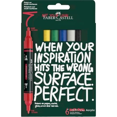 USE Meet the rebellious child of a noble family! Faber-Castell Multimark Acrylic Dual Marker draws on paper, metal, glass, wood and nerves. No surface is out of bounds with this new water-based acrylic ink marker. Essential art set supplies TIP Faber-Castell Acrylic double ended markers features a bold 2–3mm and fine 1-1.2mm tip. Round tips are replaceable. Ideal alternative to paint markers, ohuhu, posca, watercolour pens CREATIVITY Paint on multi-surfaces, these pens are not your usual Faber-Castell! Make something messy and creative with these acrylic brush and fine tip pens. Perfect for adult too. These pens carry an extended shelf like of 36 months RANGE Faber-Castell Multimark Acrylic Dual Markers are available in a great variety of 47 colours including brights, metallic and also an assortment of sets too. These pens make a great gift for any art enthusiast or creativity lover BRAND Faber-Castell is globally renowned and loved. They are a world-leading manufacturer of top-quality, innovative art materials. Faber-Castell have become the go-to brand for artists for centuries, whether professional or hobbyist