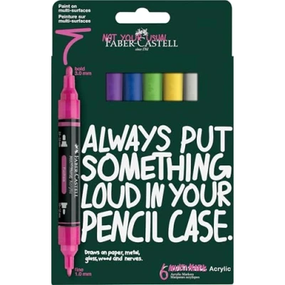 Faber Castell Multimark Acrylic Dual Marker, Set of 6 Vibrant Colours, Art Supplies, Water Based Marker Pen, Double Ended, Bold & Fine Tip, Markers, Colouring Pens, Highlighters