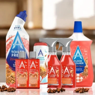 Cleaning doesn’t have to be a chore – turn it into an enjoyable routine with the Astonish Winter Spice Cleaning Bundle. This specially curated 7-piece set includes everything you need to keep your home fresh, hygienic, and beautifully scented with the comforting aroma of winter spices. Wave goodbye to tedious cleaning and say hello to an invigorating, aromatic experience that will leave your home feeling cosy and welcoming.. What's Inside the Astonish Winter Spice Cleaning Bundle?. This complete set is designed to handle any mess with ease. Here’s a closer look at each item included in the bundle:. 2 x Astonish Winter Spice Ready-to-Use Disinfectant Spray (550ml). Ready for action whenever you are, these disinfectant sprays are convenient for everyday cleaning. They’re ideal for countertops, door handles, and other surfaces that could use a quick, fragrant refresh.. 2 x Astonish Winter Spice Concentrated Disinfectant 300ml. Transform your cleaning routine with Astonish Winter Spice Concentrated Disinfectant. Designed to eliminate 99.9% of bacteria and enveloped viruses, this potent formula also fills your home with the comforting aroma of cinnamon, nutmeg, and clove, complemented by creamy vanilla and caramel undertones. Keep your space sparkling clean and wonderfully cosy with Astonish.. 1 x Astonish Winter Spice Shake & Fresh Carpet Freshener (350g). Keep your carpets smelling festive and fresh with the Shake & Fresh Carpet Freshener. Simply sprinkle it on, wait a few moments, and vacuum it up to eliminate odours and leave a gentle scent behind.. 1 x Astonish Winter Spice Floor Cleaner (1 Litre). Transform the feel of your home as you mop with this warm winter-spice-scented floor cleaner. Designed to lift dirt and grime, it leaves your floors sparkling and your space filled with a welcoming fragrance.. 1 x Astonish Winter Spice Toilet Fresh Cleaner (750ml). Even your bathroom can enjoy the winter magic! This powerful toilet cleaner removes stains and odours, leaving a beautiful, Winter Spice scent aroma for an elevated, seasonal twist on cleanliness.. Why Choose the Winter Spice Cleaning Bundle?. Effortless Cleaning with a Touch of Festive Magic. This bundle brings convenience, quality, and a touch of seasonal charm to every room in your home. With products designed for surfaces throughout your space, it’s easy to maintain cleanliness with just a hint of indulgence.. Aromatherapy for Your Home. Winter Spice doesn’t just clean – it uplifts. The warm, spicy aroma fills your home with a comforting scent that will remind you of cosy winter days. It’s more than cleaning; it’s a seasonal refresh that transforms your environment.. Embrace the Joy of a Clean, Scented Home. With the Astonish Winter Spice Cleaning Bundle, you’re not just tackling dust and grime – you’re inviting an aromatic, seasonal experience into your home. Make cleaning a little more special this winter and discover the delightful difference!