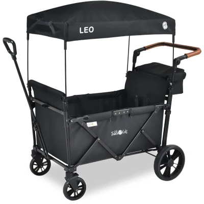 General description The FableKids LEO X2Lite Foldable Cart in Onyx Black is a versatile and stylish handcart designed for family outings. It features a spacious interior and a generous rear bag, making it perfect for excursions, festivals, or any leisure activities with children. The removable roof provides flexibility and protection from sun and rain, ensuring a comfortable experience for your little ones. Technical specifications Color: Onyx Black Weight: 15 kg Total load capacity: 80 kg Load capacity per seat: 20 kg Dimensions unfolded (LxWxH): 113 x 68 x 130 cm Dimensions folded (LxWxH): 93 x 68 x 38 cm Volume interior: approx. 146 L Height of handlebar: adjustable from 63 to 116 cm Front wheel dimension: 16 cm Rear wheel dimension: 27.5 cm Wheels: 360° rotation Material of fairing: 600D Oxford fabric Material of frame: Steel Compatibility and accessories Includes roof, rear bag, and storage cover Suitable for children aged 0-4 years Can accommodate two seats Installation The roof