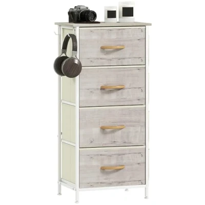 General description Easy, simple storage with this HOMCOM fabric chest of drawers. With four identical drawers, it's easy to sort everything from socks to pants. It also features four side pockets and two hooks to keep smaller accessories organized. Technical specifications Colour: Natural Wood Finish, White Materials: Non-Woven Fabric, Steel, Particle Board Overall Dimension: 45W x 30D x 94.5H cm Drawer Inner Size: 39W x 28D x 20.5H cm Each Storage Pocket Size: 29W x 86H cm Ground Clearance: 8.5 cm Maximum Load: 10 kg (Top), 3 kg (Each Drawer), 20 kg (Total) Item Label: 83D-064V00ND Installation Assembly required Anti-tipping kit included to safely secure to a wall Usage Soft fabric drawers fitted with handles for easy opening/closing Foldable drawers collapse flat for compact storage when not in use