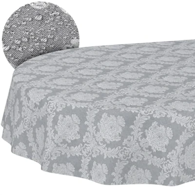 Fabric Tablecloth, Textile Table Linen, Cotton Polyester, Washable, Plain Ornamental Damask Jacquard Fabric, Baroque Grey, Oval, 180 x 140 cm, Cut Edge
