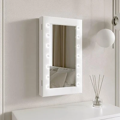 FABS Katie Jewellery Storage Cabinet with Mirror & LED Lights Wall Mounted Tabletop Armoire for Bedroom, Vanity Cosmetics Beauty Organiser Ring, Necklace Earring Holder White