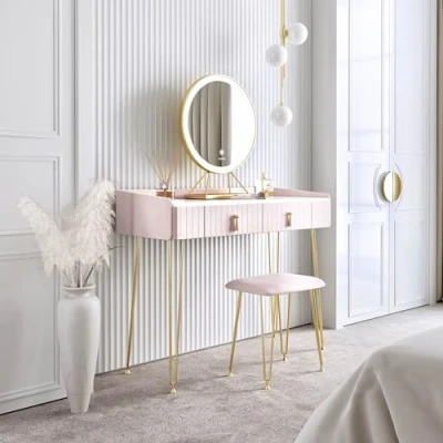 [ELEGANT DESIGN] A stunning rectangular dressing table wrapped in plush velvet fabric with a luxurious white marble effect tabletop. This upholstered velvet makeup table is tastefully accented with champagne gold hairpin style legs which add to the premium aesthetic. [MULTIPLE STORAGE] This piece features two spacious drawers which can be used to store and organise your whole collection of makeup and jewellery. This is fronted with a tassel style handle, complementing the champagne gold elements of the vanity table. [MATCHING STOOL] This set includes a matching square stool. The stool features the same hairpin style legs and plush velvet making it extra comfortable for long makeup sessions. [LED MIRROR LIGHTS] The gold circular mirror can be moved around or removed completely for a little extra table space. It also features a dimmable LED light activated with a touch sensor and comes with three different colour settings: Warm, Cool and Day. [MORE COLOURS] This luxury dressing table is available in colours: Dove Grey, Ballerina Pink, Baby Blue and Raspberry.