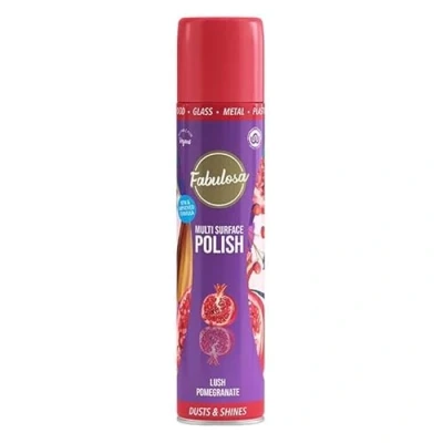 Experience the power of Fabulosa's Multi Surface Polish! Its new and improved formula is designed to bring out the best in wood, glass, metal, and plastic with the delightful scent of lush pomegranate. Sparkle and shine, and make your home exemplary!. 1 x Fabulosa Multi Surface Polish Lush Pomegranate 300ml. Suitable for wood, glass, metal and plastic surfaces. Suitable for vegans. Lush pomegranate scent