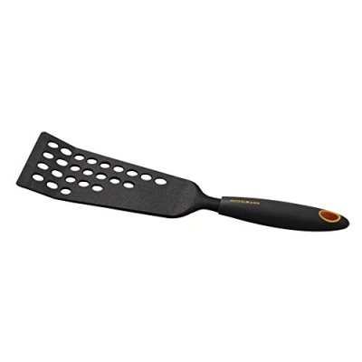 MULTI-PURPOSE - Ideal for easily turning your food without breaking, so you can display your food flawlessly. For example, frying, bacon, or lift a whole fish thread. Practical: the holes allow fat and frying oil to drip out of the food before frying. Also ideal for use with non-stick baking trays as the coating is not damaged. Box contents: 1 x extra long perforated shovel Material: nylon and silicone, dishwasher safe Dimensions: approx. 31 x 8.5 cm.