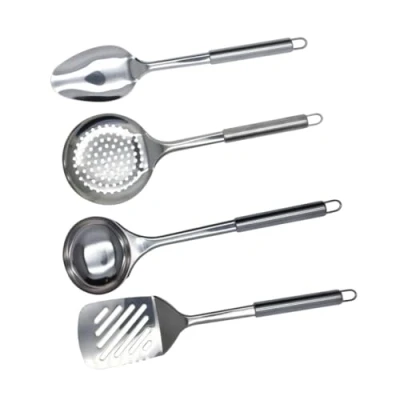 Fackelmann 9908150 Set of 4 Stainless Steel Kitchen Utensils, Ladle, Skimmer, Spatula, Spoon, Steel, 33.5 x 8 cm