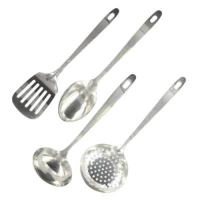 Fackelmann 9908950 4 Piece Stainless Steel Kitchen Utensils Set, Ladle, Serving Spoon, Skimmer, Spatula, Steel, 32 x 8 3 cm