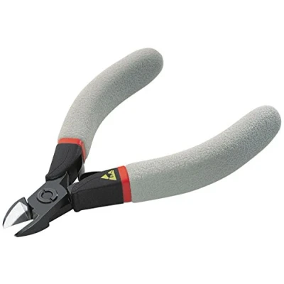 Diagonal side cutters with ESD protection for wire max. 0.5 mm | axial cut Product thicknesses: protection of electronic components against the dangers of electrostatic discharges (ESD)|Pliers for a precise cut of many materials from copper wire to piano wire max. 0.5 mm. The model with section restraint device prevents the wire from ejection. Technical data: B [mm]: 10.5 | C [mm]: 11.5 | E [mm]: 7 | L [mm]: 110 | Cut: h|Cu - Ni [mm]: 0.3 - 1.4 | Fe 30. HRc dia. [mm]: 0.8 | Piano wire diameter. [mm]: 0.5 | Retention device: -, Weight: 0.0440924524 Pounds, Manufacturer: Facom