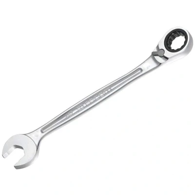 General description The FACOM Ultra Grip Mixed Metric Key with Ratchet, Model 467B.19, is a versatile combination ratcheting spanner designed for both professional and DIY applications. It features a reversible ratchet system integrated into a compact ring head and a fixed open end, making it ideal for various fastening tasks. The spanner is engineered with a 15-degree angle and a fine ratchet mechanism that allows for a 5-degree working arc, enabling efficient tightening and loosening in tight spaces. Its satin chrome finish ensures durability and corrosion resistance, while the innovative Ring Stop system prevents fasteners from slipping off the ring end. The open end is designed with an anti-slip jaw for a secure grip, and the compact I-Beam shaft profile provides comfort and allows for higher torque application over extended periods. Technical specifications Size: 19mm Material: Chrome vanadium steel Finish: Satin chrome Ratchet system: Reversible with a 5-degree working arc Head
