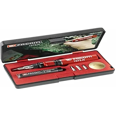 No solder will resist it: This 24W butane gas soldering iron is used for welding and galvanizing work that requires greater power, given the mass of the parts to be assembled, inducing significant thermal inertia. Use this precision soldering iron immediately: This device is switched on by piezo. After only 40 seconds, the iron is ready to use. It can contain 10 ml of fuel for a lifespan of up to 55 min for recharging. Its maximum temperature reaches 1300°C A complete soldering iron: This model comes in a storage box with 4 1075.HS soldering tips and 1 1075.HD soldering dispenser. The temperature of the fault is 250-550°C and that of the torch is 1100°C Safety and sustainability above all: Our products have all been made with high quality components for a long lifespan. They have undergone numerous extensive tests before being marketed and correspond to the European standards in force. 100 Percent satisfaction guarantee: At FACOM, we not only offer you a wide range of professional quality DIY products, we support them with excellent customer service.