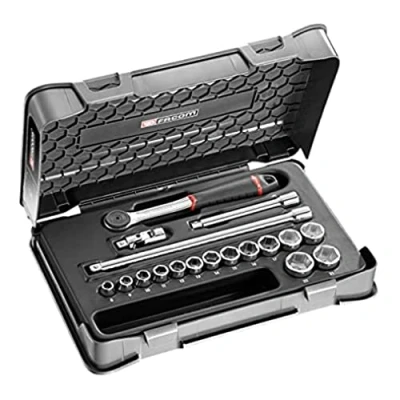 18 piece socket set 1 x 3/8" high performance waterproof ratchet 3/8-inch 6-point sockets 2 x 3/8-inch extension cords Comes with a pictogram board to personalise your box, Weight: 4.299014109 Pounds, Manufacturer: FACOM