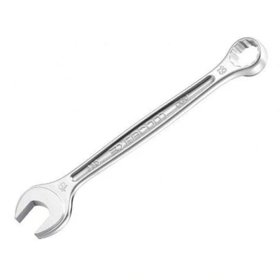 General description This combination spanner features one open end and one ring end, designed for versatile use in various applications. The open end is angled at 15 degrees for better access in confined spaces, while the ring end is thin-walled with a high relief zone for recessed or hard-to-reach bolts. Made from hardened steel and finished with a satin chrome coating, it offers durability and corrosion resistance. Suitable for tasks in DIY, plumbing, construction, and automotive work. Technical specifications End Style: Combination Finish/Coating: Satin chrome Material: Hardened steel Metric size: 32mm Overall length: 355mm Number of points: 12 Number of pieces: 1 Standards met: ISO 3318, DIN ISO 691, NF ISO 691, NF ISO 7738, ISO 1711-1, DIN 1711-1, E74-306, ASME B107.100 Installation Use the open end or ring end to tighten or loosen bolts and nuts. Ensure the tool fits securely onto fasteners before applying force. Usage Designed for tightening or loosening fasteners in various