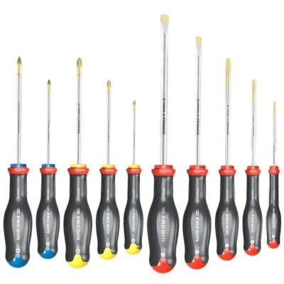 General description The Facom Protwist® Screwdriver Set includes 10 high-quality screwdrivers designed for durability and comfort. Featuring a gold-colored zinc coating, these screwdrivers offer 100% more tip life. The handles are made from a material that is 12% softer (SHORE rating), ensuring optimum comfort and control during use. An ergonomically designed ‘power channel’ molded into the center of the handle enhances grip and increases torque transfer by 10%, making it easier to tackle challenging tightening or unfastening tasks. The screwdrivers also feature color-coded ends for easy identification. Technical specifications Set includes: 5 x Slotted Screwdrivers: 2.5 x 75mm, 3.5 x 100mm, 5.5 x 125mm, 6 x 150mm, 8 x 175mm 3 x Phillips Screwdrivers: PH0 x 75mm, PH1 x 100mm, PH2 x 125mm 2 x Pozidriv Screwdrivers: PZ1 x 100mm, PZ2 x 125mm