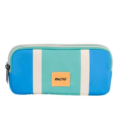 Pencil case with 3 spacious compartments to easily organize contents. Series 3 Lines, inspired by the colors and lines of FACTIS 3 LINES erasers. Blue and green shades. Fabric composition: polyester outer fabric and inner lining. Dimensions: 22 x 11 x 6.5 cm.