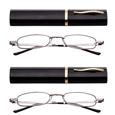 Fads & Fashions 2 x PAIRS MIX N MATCH Pen Holder Gunmetal Grey Frame Compact Reading Glasses with Case MT74 (2 Black, 2.0)