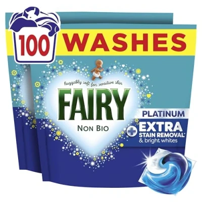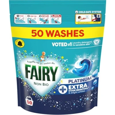 EXTRA STAIN REMOVAL & BRIGHT WHITES: Fairy Non Bio Platinum washing capsules provide Extra stain removal (vs Fairy Non-Bio PODS) & bright whites VOTED #1 LAUNDRY DETERGENT for sensitive skin (Recurrent survey; reviews may have received free product or vouchers; verification at [email protected]) DISSOLVES EVEN IN COLD: Fairy Pods dissolve and work brilliantly even in at lower temperatures HOW TO USE: Pod first, laundry on top TRY OUR SENSITIVE SKIN DREAM TEAM: Use in combination with Fairy Fabric Conditioner for snuggly softness & Scent Booster for a mild scent that lasts