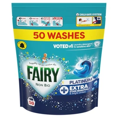 EXTRA STAIN REMOVAL & BRIGHT WHITES: Fairy Non Bio Platinum washing capsules provide Extra stain removal (vs Fairy Non-Bio PODS) & bright whites VOTED #1 LAUNDRY DETERGENT for sensitive skin (Recurrent survey. Reviews may have received free product or vouchers. Verification at [email protected]) DISSOLVES EVEN IN COLD: Fairy Pods dissolve and work brilliantly even in at lower temperatures HOW TO USE: Pod first, laundry on top TRY OUR SENSITIVE SKIN DREAM TEAM: Use in combination with Fairy Fabric Conditioner for snuggly softness & Scent Booster for a mild scent that lasts
