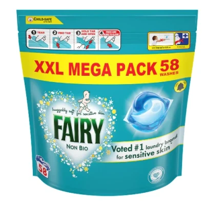Give your laundry a gentle yet effective clean with Fairy Non Bio Pods. Designed for sensitive skin, this 58-wash pack offers trusted stain removal and fabric softness, all in a convenient all-in-one pod.. Pack of 58 All-in-1 pods pre-measured for no-fuss laundry. Dermatologically tested suitable for sensitive skin and baby clothes. Gentle formula with effective stain-fighting power. Leaves clothes soft with a light skin-friendly scent. Dissolves completely in wash even at low temperatures