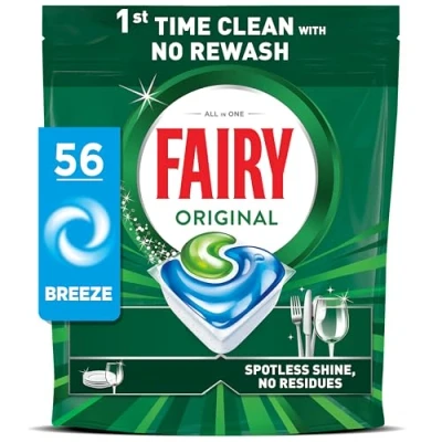 Fairy Original Power Dishwasher Tablets Breeze, 56 Capsules, 1st Time Cleaning Action With No Rewash, Effective on 100% Grease, Spotless Shine Without Residues