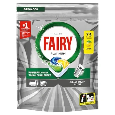 Fairy Platinum Dishwasher Tablets, Lemon, 73 Capsules, Powerful Even On Tough Cleaning Challenges, Clean Dishes, Shiny Machine, Cleans Greasy Filter