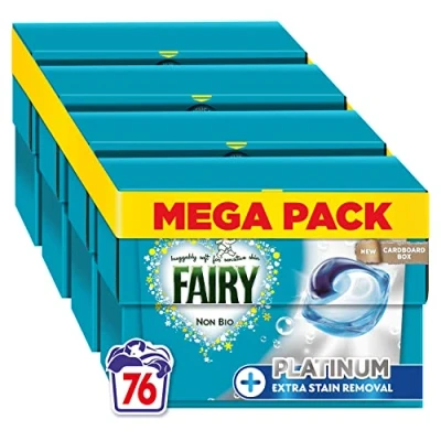 Discover the strength and care of Fairy Non Bio Platinum PODS: Fairy's best softness (vs other Fairy Non Bio detergents Platinum PODS vs Fairy PODS) now with Extra Stain Removal Voted No.1 Laundry Brand for Sensitive Skin (Online panel of 3327 females among which Fairy Non Bio detergent was voted most often as the #1 laundry detergent for sensitive skin) Discover the gentle care of Fairy Non Bio PODS Washing Liquid Capsules, with hygienic clean and Fairy best softness (vs other Fairy Non Bio detergents) ECOCLIC CARDBOARD BOX: Let's reduce plastic with Fairy Non Bio PODS washing capsules now coming in a recyclable cardboard box, containing maximum 5% plastic, designed to preserve your PODS 100% WATER-SOLUBLE FILM: Laundry detergent washing PODS have a 100% water-soluble film
