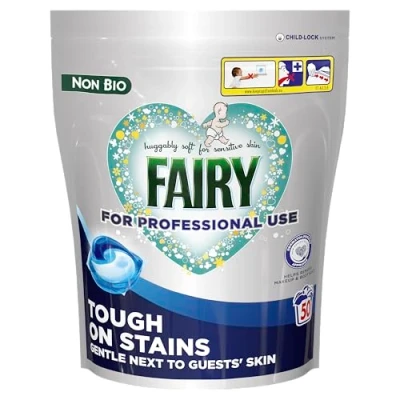 Designed for Tough Stain Removal: Effective on 100% of Greasy Stain Types* *based on typical types of greasy stains found in professional businesses Tough on Stains, Gentle Next To Guests' Skin Outstanding cleaning: Helps remove Make-Up & Body Soils fairy professional non-bio podswashing capsules laundry pods liquid washing detergent bulk pro for foodservice hospitality use clean machines fresh sensitive skin dermatologically tested safety