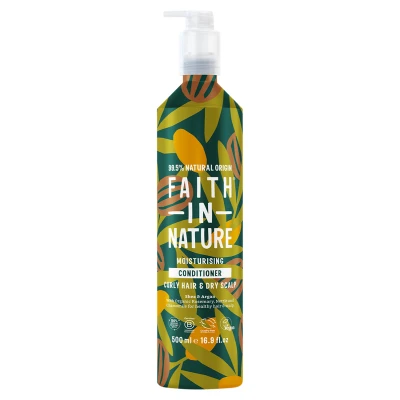 Faith in Nature Shea&Argan Conditioner 500ml is a 99.5% natural, vegan, and cruelty-free formula that deeply moisturizes curly hair and dry scalp. Enriched with organic rosemary, nettle, and chamomile extracts, it nourishes, reduces frizz, and enhances shine—while being eco-friendly and refillable.