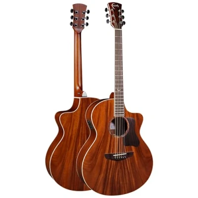 A WARM TONE: Solid Trembesi Tonewood construction delivers warm, balanced tone whether played acoustically or through an amplifier. VERSATILE SIZE: The Baby-Jumbo body design has a cutaway for easy access to upper frets. PREMIUM PLAYABILITY: A Mahogany neck with a genuine Ebony fretboard and TUSQ nut/saddle provide smooth, comfortable playability for players of any level. AMPLIFIED PERFORMANCE: The onboard Fishman pickup and preamp makes it easy to amplify or record your new acoustic. A REAL HEAD-TURNER: The solid tonewood's natural beauty is enhanced further with a coffee brown stain and hi-gloss lacquer.