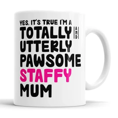 ADORABLE STAFFY MUG: Enjoy your favourite drink, be it tea or coffee, while letting the world know you're a StaffyDog lover every time with our pawsome Staffy mum mugs! Our mugs make great Birthday, Christmas, Mother's Day or Father's Day gifts for a proud Staffy mum! PERFECT GIFT FOR STAFFY LOVERS: Surprise the Staffy lover in your life with this thoughtful and practical gift. Whether you're looking for a funny or meaningful gift, for birthdays, holidays, or just to show appreciation, this dog-related mug is sure to bring joy. LOVINGLY HANDMADE IN BRITAIN: Designed, printed and packed in-house at our Lancashire based premises. Crafted from durable ceramic, this mug is built to last, ensuring long-lasting enjoyment for dog enthusiasts. The high-quality materials also make it microwave and dishwasher safe for convenient use. We are also proud to be accredited by Made In Britain. PACKAGED CAREFULLY: All our mugs are packaged in fully recyclable, carboard smash-proof boxes, ensuring your items get to you as intended, ready for your next cup of tea or coffee. VERSATILE AND FUN: Not just for drinks, this mug can also be used as a desk organizer, pen holder, or simply as a decorative piece. Its versatile design makes it a delightful addition to any dog lover's collection. PURCHASE WITH CONFIDENCE: We want you to be 100% Satisfied with your mug so if, for any reason, that's not the case, please feel free to reach out to us so that we can resolve your concerns., Weight: 0.881849048 Pounds, Manufacturer: Chorley Print Ltd