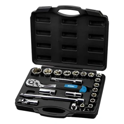 ManoManoGeneral description This Faithfull 1/2in Socket Set comes packed in a durable storage case, featuring 1/2-inch square drive sockets made from durable chrome-vanadium steel. The sockets are designed with curved sidewalls to efficiently apply torque to flat surfaces, preventing any rounding of the fastener head. All sockets adhere to the DIN3124 Standard, while the ratchet handle meets the DIN3122 requirements. Technical specifications 22 pieces in total Material: Chrome-vanadium steel Socket sizes: 10, 11, 12, 13, 14, 15, 16, 17, 18, 19, 22, 24, 27, 30, 32mm Spark plug socket sizes: 16mm and 21mm Extension bar lengths: 5in and 10in Ratchet handle: 72 Tooth, soft-grip, quick-release Compatibility and accessories 15 x Shallow Sockets 2 x Spark Plug Sockets 2 x Extension Bars 1 x 3/8inF x 1/2inM 3-way Adaptor 1 x Universal Joint