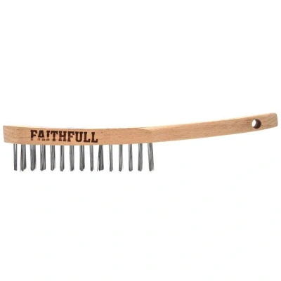 General description This lightweight scratch brush is designed for surface preparation tasks such as removing rust, scale, old paint, and grout. It features durable, hardened, and tempered wire bristles for effective abrasion. The handle is made from FSC-certified beech wood, ensuring sustainable sourcing, and includes a hanging hole for easy storage. Technical specifications Number of rows: Four Wire gauge: 28 Handle material: FSC-certified beech wood Handle features: Drilled for hanging Compatibility and accessories Suitable for use on metal, wood, and other surfaces requiring surface preparation Installation No installation required; ready to use out of the box Usage Use the brush to remove rust, paint, scale, or grout from surfaces Apply firm, even pressure for effective cleaning