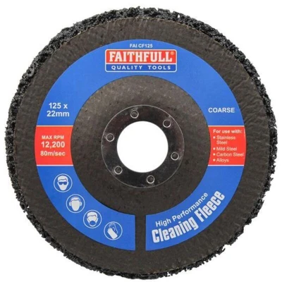 General description This Faithfull Cleaning Fleece Disc Coarse 125 x 22mm is designed for effective removal of rust, paint, and thermal blueing on stainless steel, mild steel, carbon steel, and alloys. It is ideal for surface preparation while minimizing the risk of scratching. Technical specifications Size: 125 x 22 mm Material: Fibreglass backing with abrasive fleece surface Application: Surface cleaning, rust and paint removal, thermal blueing removal MPN: FAICF125 EAN: 5023969005782 Compatibility and accessories Compatible with standard angle grinders Installation Attach the fleece disc securely to your angle grinder using the appropriate mounting system Ensure the disc is properly centered and tightened before use Usage Operate the angle grinder at a suitable speed for surface cleaning tasks Apply gentle pressure and move the disc evenly across the surface for effective cleaning Wear appropriate safety gear, including gloves and eye protection Other information